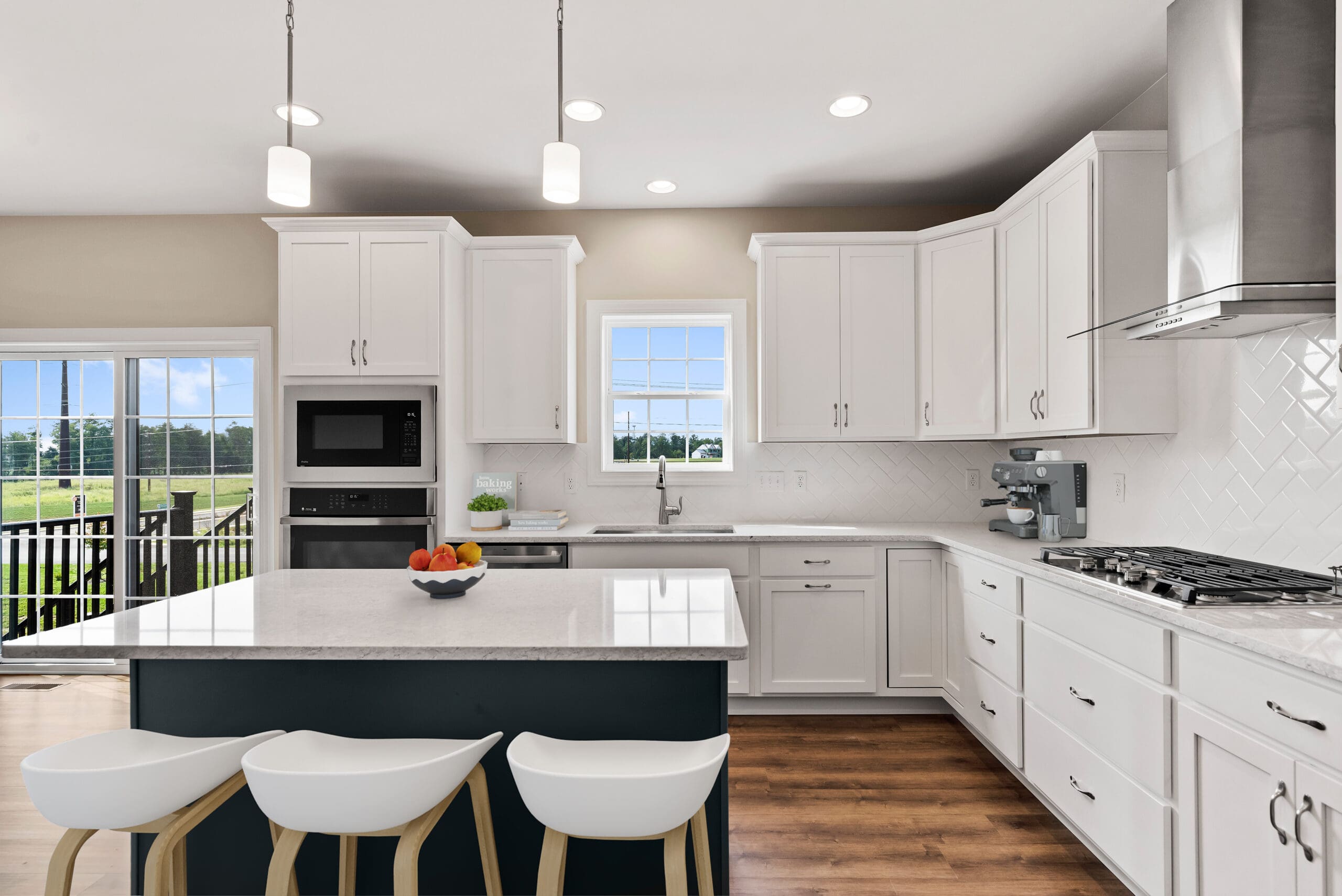 The luxury kitchen includes quartz counters, 42” cabinets with soft-close doors and drawers, double oven, a 36″ gas cooktop with hood vented to the exterior, and microwave drawer in the amazing oversized island!